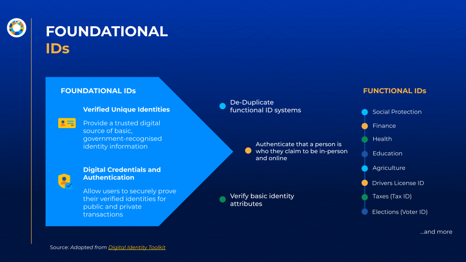 A **Foundational Identity System** provides individuals with a unique identifier issued by the government, enabling identity assertion and verification across multiple services. Unlike functional IDs, which are designed for specific use cases such as healthcare, finance, and social services, foundational IDs serve as a universal framework that various sectors can leverage.